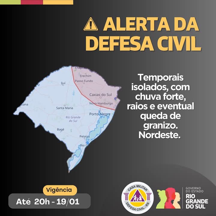 O aviso é válido até as 20 horas deste domingo (19) A Defesa Civil emitiu um alerta para a possibilidade de temporais isolados nas próximas horas. Segundo o comunicado, há previsão de chuva forte, raios e eventual queda de granizo em algumas regiões.
