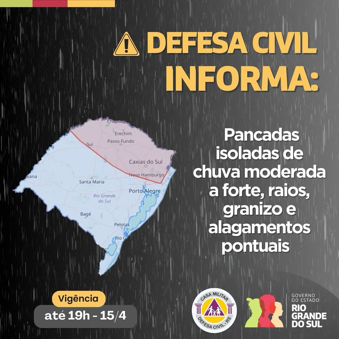 A Defesa Civil do Rio Grande do Sul emitiu um alerta válido até às 19h desta quinta-feira (10), informando a possibilidade de pancadas isoladas de chuva moderada a forte, acompanhadas de raios, granizo e alagamentos pontuais. As áreas com maior risco são as regiões Noroeste, Centro-Norte, Nordeste, Serra e parte da Região Metropolitana de Porto Alegre (RMPOA).