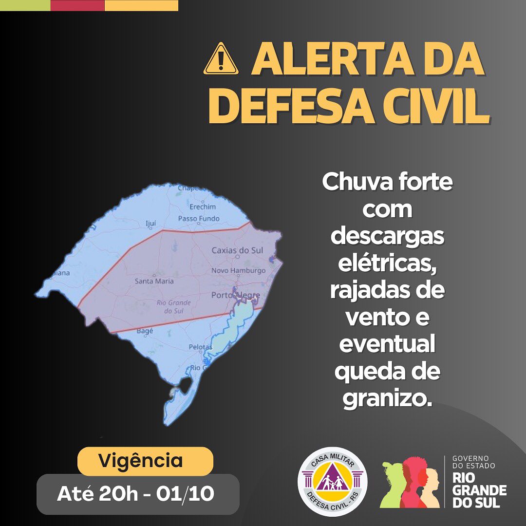 A Defesa Civil emitiu um alerta para a possibilidade de chuvas fortes acompanhadas de descargas elétricas, rajadas de vento e eventual queda de granizo nas regiões Central do Estado, Vales, Região Metropolitana de Porto Alegre (RMPOA) e Serra. Diante do risco de tempo severo, a recomendação é que a população tome medidas preventivas para garantir a segurança.