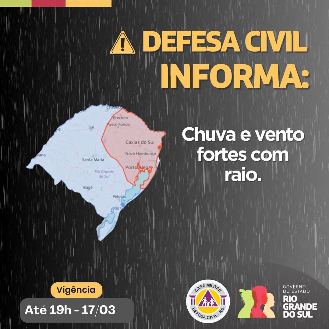 Alerta é válido até as 19 horas desta segunda-feira A Defesa Civil emitiu um alerta para a ocorrência de chuva intensa, ventos fortes e raios nas regiões destacadas em vermelho no mapa meteorológico. A recomendação é que a população fique atenta às condições climáticas e tome medidas preventivas para evitar acidentes.