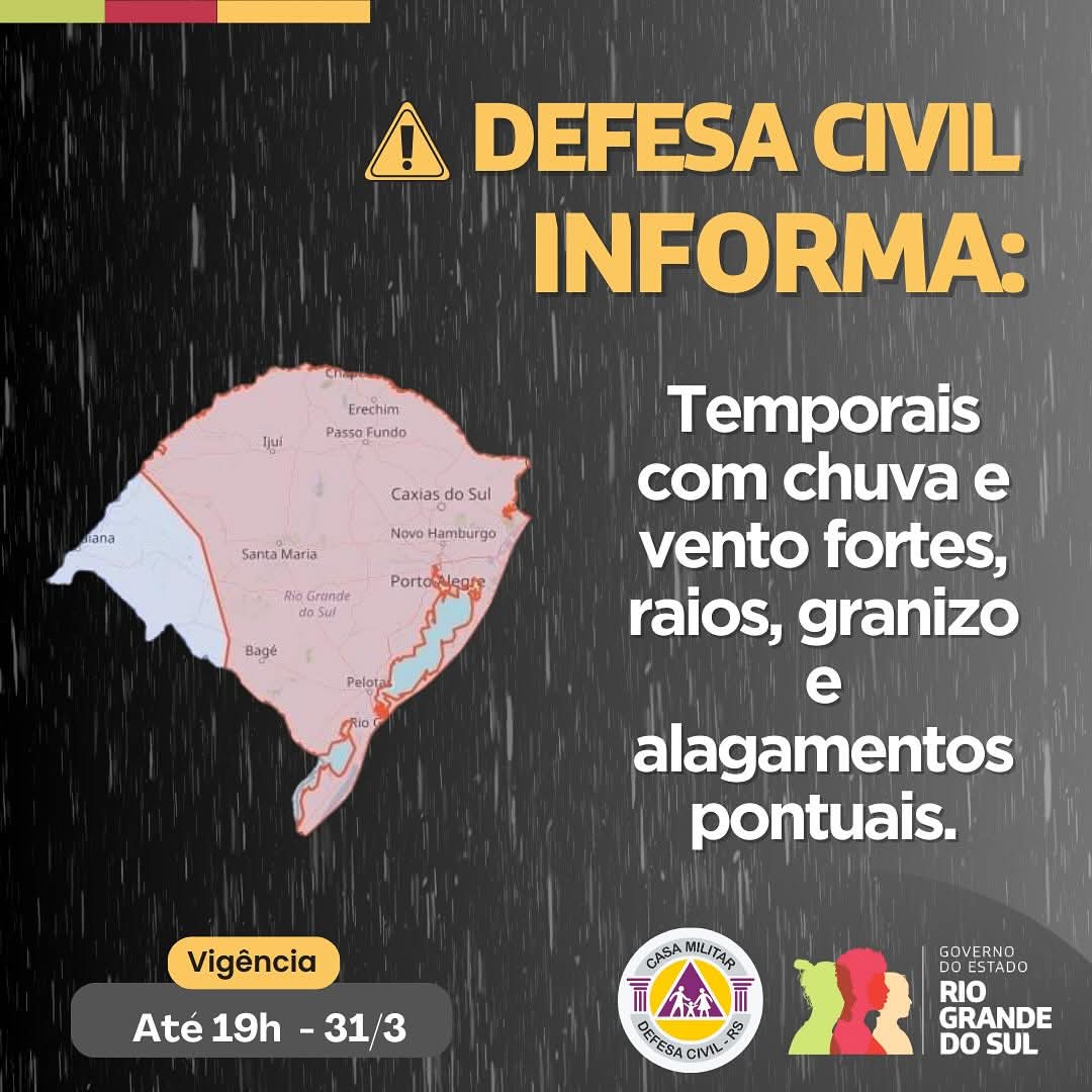 Os moradores também devem abrigar e proteger seus animais durante os temporais. Em caso de emergência, os telefones 190 (Brigada Militar) e 193 (Corpo de Bombeiros) estão disponíveis para atendimento.