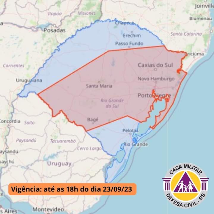 Alerta vale para a área em vermelho no mapa Por volta das 11 horas deste sábado a Defesa Civil do Rio Grande do Sul emitiu um importante alerta para a população, visando a segurança de todos.