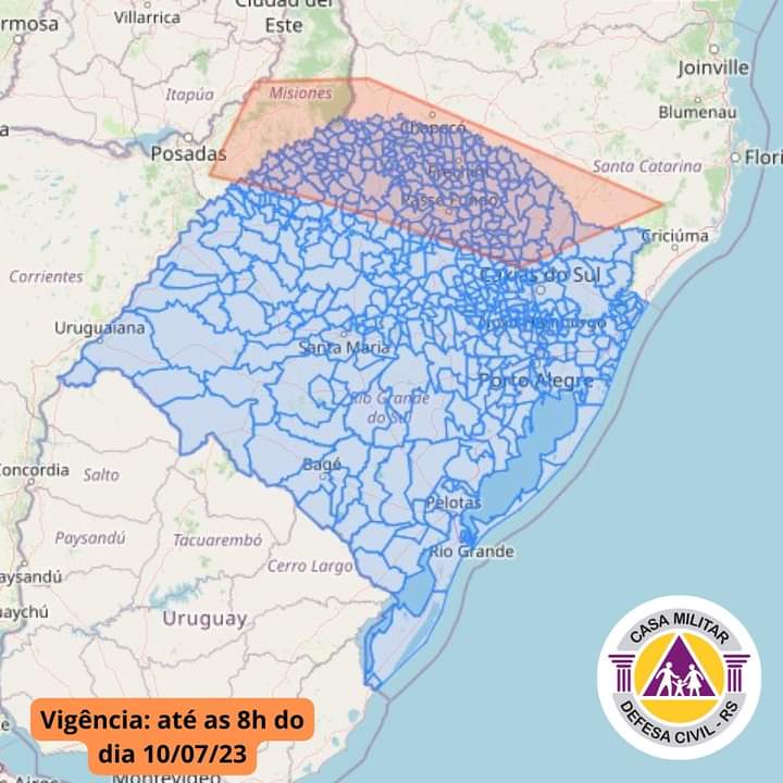Alerta é válido para a área em vermelho no mapa Na noite deste domingo a Defesa Civil do Rio Grande do Sul emitiu alerta para chuva forte, descargas elétricas, ventos de até 70 km/h e eventual queda de granizo nas regiões Noroeste, Norte e parte do Nordeste gaúcho.