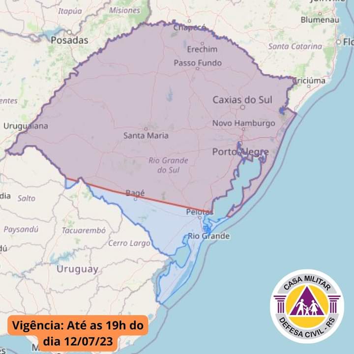 O alerta é válido até as 19 horas Na manhã desta quarta-feira a Defesa Civil do Rio Grande do Sul emitiu um alerta para chuva forte, descargas elétricas, ventos de até 90 km/h e eventual queda de granizo. O alerta é válido até as 19h desta quarta-feira (12). Em caso de emergência ligue 190/193 .