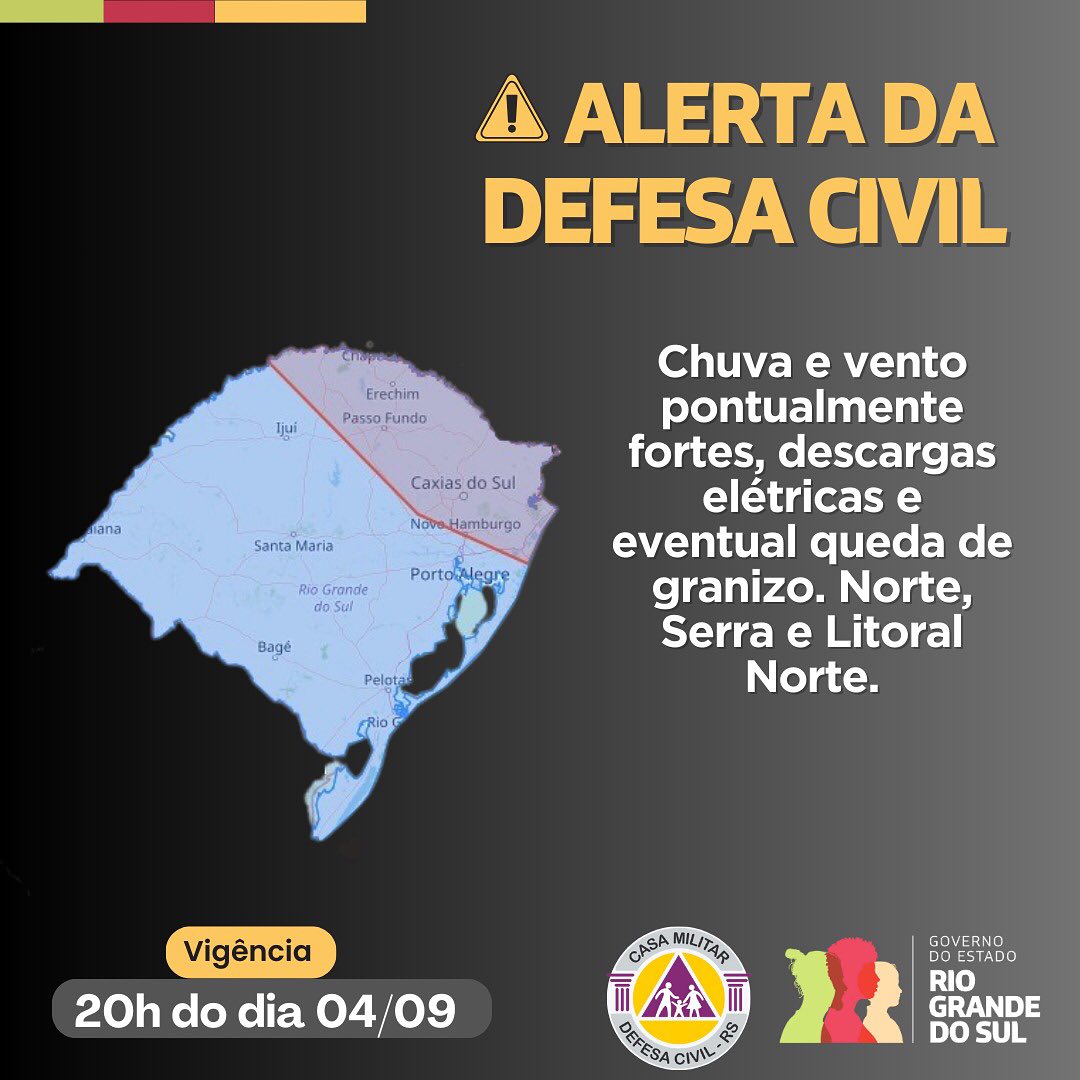 Alerta é válido até as 20 horas desta quarta-feira (04/09) na área em vermelho no mapa A Defesa Civil emitiu um alerta para a possibilidade de chuva e ventos pontualmente fortes, descargas elétricas e eventual queda de granizo nas regiões norte, Serra e Litoral Norte. O alerta é válido até as 20h desta quarta-feira.