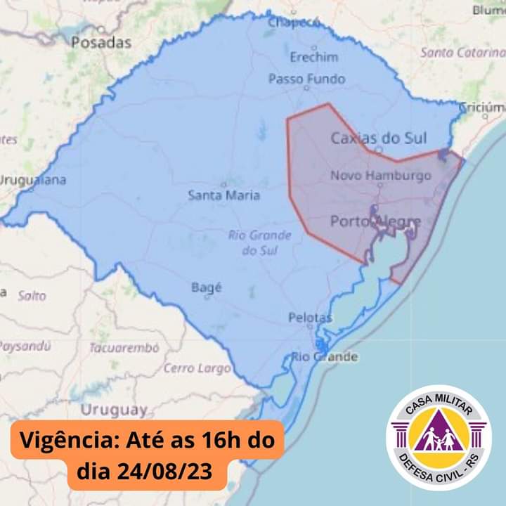 Alerta vale até as 16 horas Por volta das 13 desta quinta-feira (24) a Defesa Civil do Rio Grande do Sul emitiu um alerta de temporais isolados, com descargas elétricas e eventual queda de granizo. O alerta é válido até 16h na área em vermelho no mapa. Em caso de emergência ligue 190/193.