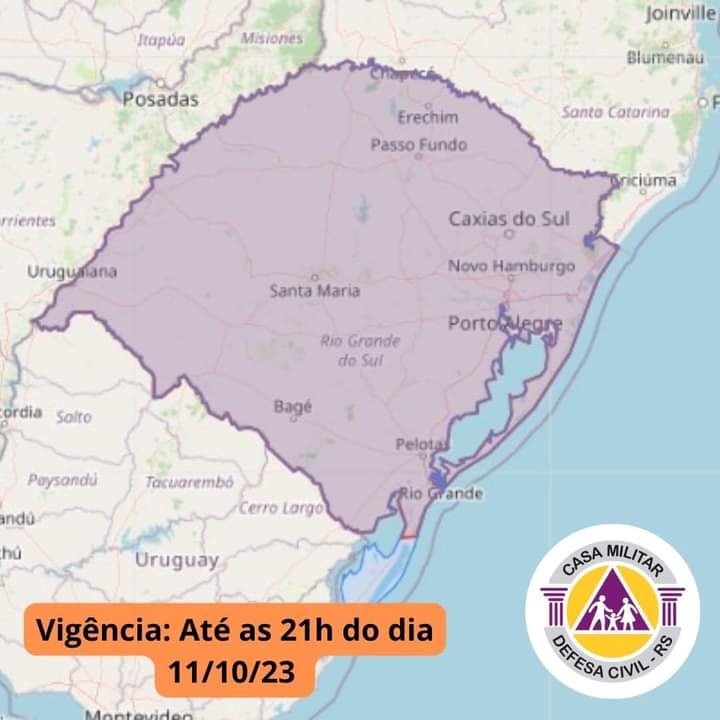 Alerta vale para todo o Rio Grande do Sul até às 21 horas A Defesa Civil acaba de emitir um novo alerta devido às condições meteorológicas adversas que afetarão a região.