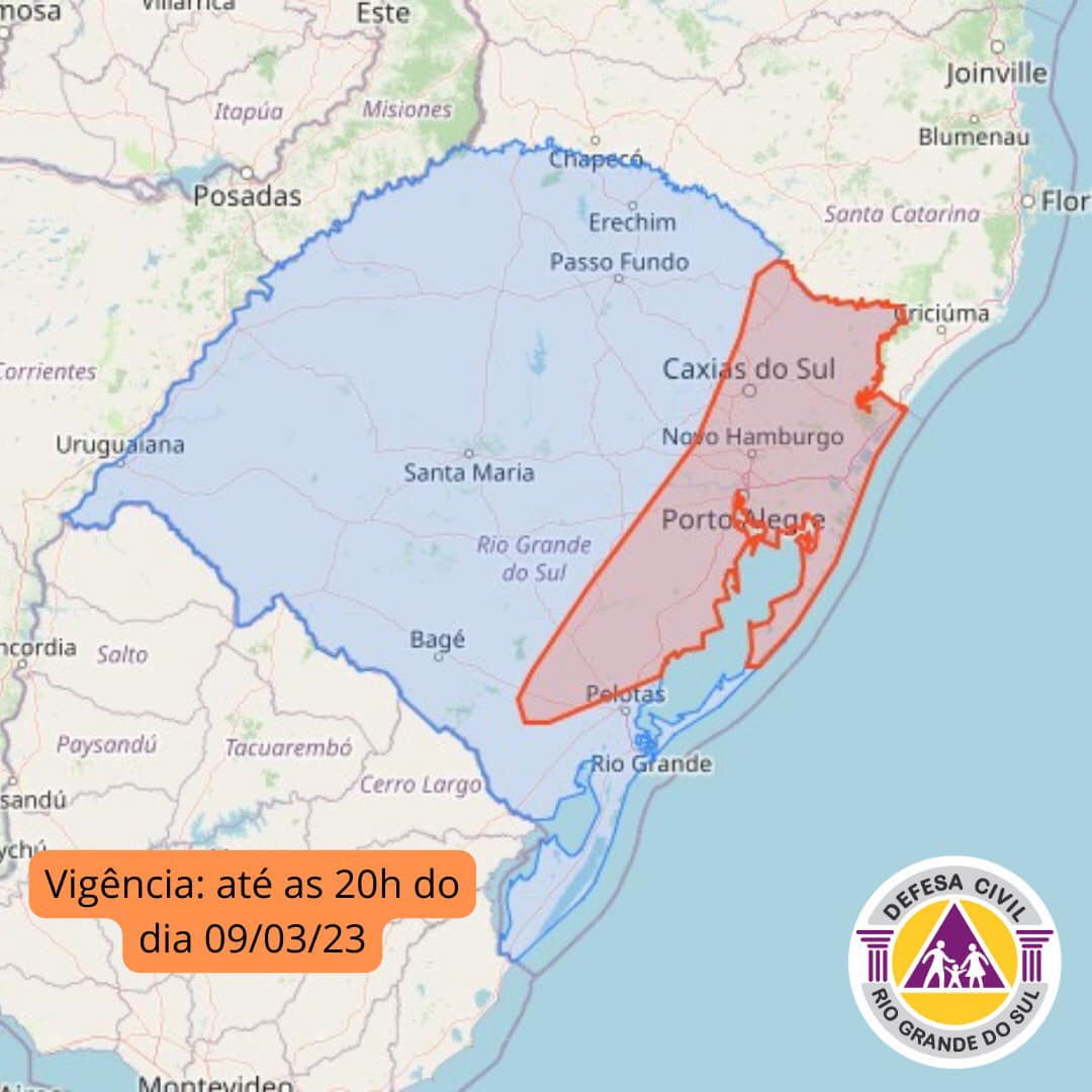 O alerta é válido até às 20h na área em vermelho no mapa. Em caso de emergência ligue 190/193.