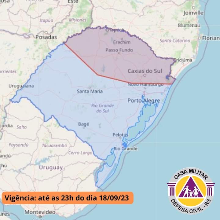 Alerta vale até as 23 horas Por volta das 15h30 desta segunda-feira a Defesa Civil do Rio Grande do Sul emitiu um alerta de temporais, com chuva forte, descargas elétricas, eventual queda de granizo e rajadas de vento. O alerta é válido até às 23 horas desta segunda (18) na área em vermelho no mapa.