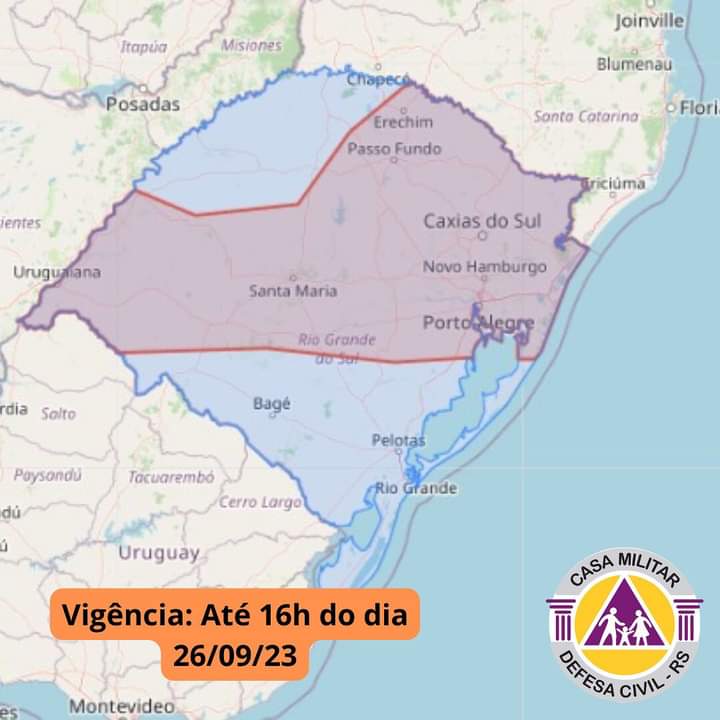 Alerta vale até as 16 horas Por volta das 11h desta terça-feira (26) a Defesa Civil do Rio Grande do Sul emitiu um novo alerta de temporais, chuvas volumosas, descargas elétricas, eventual queda de granizo e vento forte. O alerta é válido até 16h desta terça-feira. Em caso de emergência ligue 190/193.