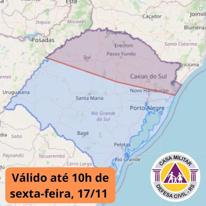 Alerta para chuva e ventos pontualmente fortes, descargas elétricas e eventual queda de granizo para a área em vermelho no mapa. Válido até 10h desta sexta-feira, 17 de novembro. Em caso de emergência, ligue 190/193.