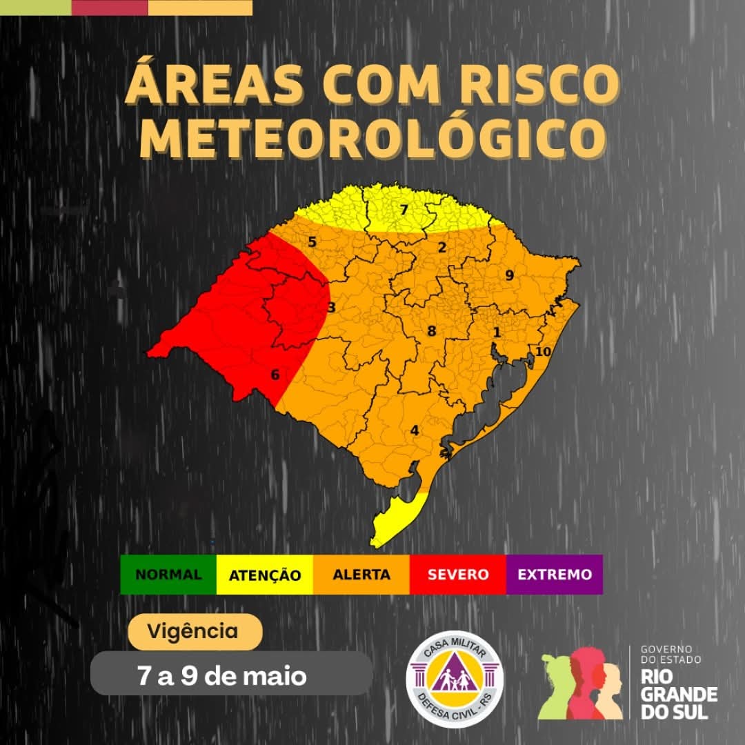 O Centro de Monitoramento da Defesa Civil Estadual atualizou nesta segunda-feira (6) o prognóstico meteorológico para os próximos dias no Rio Grande do Sul, emitindo alertas em três níveis de severidade — severo (vermelho), alerta (laranja) e atenção (amarelo) — em razão das intensas instabilidades atmosféricas previstas. O Estado deve enfrentar chuvas volumosas, temporais com granizo e rajadas de vento que podem ultrapassar os 90 km/h.