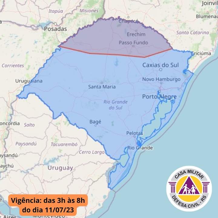A Defesa Civil do Rio Grande do Sul emitiu alerta para chuva forte, descargas elétricas, ventos de até 70 km/h e eventual queda de granizo nas regiões Norte, Noroeste e Serra Gaúcha entre 3h às 8h. O alerta vale até as 8hdesta terça-feira (11).