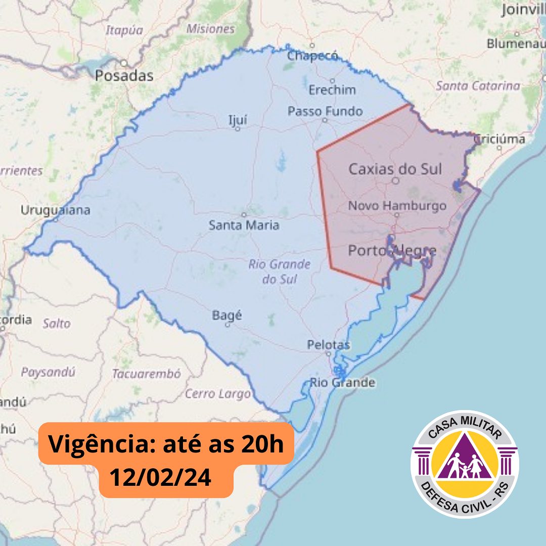 Aviso é válido até às 20 horas desta segunda-feira Por volta das 14h30 de hoje, a defesa Civil do Rio Grande do Sul emitiu um alerta para a região, prevendo a ocorrência de chuvas e ventos pontualmente fortes, descargas elétricas e eventual queda de granizo.