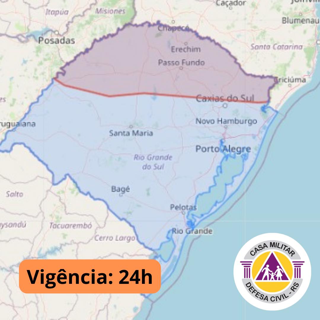 Por volta das 6h30 desta sexta-feira a Defesa Civil emitiu um alerta meteorológico para parte do Rio Grande do Sul, com previsão de chuvas intensas e volumosas nas regiões do Noroeste, Norte e Serra gaúcha, aumentando o risco de alagamentos, cheias em arroios, inundações gradativas em rios pequenos e enxurradas. A população local deve ficar atenta e tomar medidas de precaução.