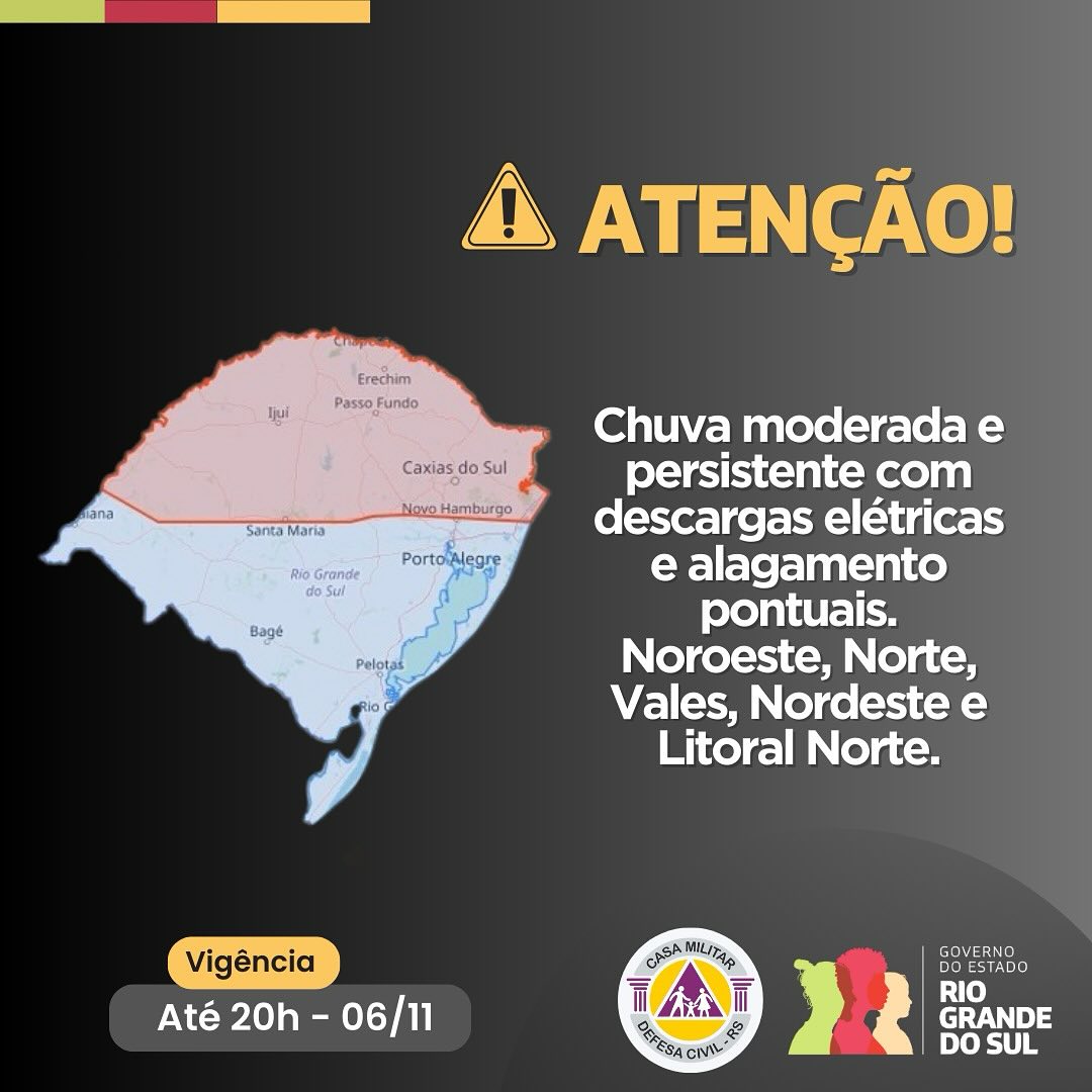 O alerta é válido até às 20h desta quarta-feira (6) A Defesa Civil emitiu um alerta válido até às 20h desta quarta-feira sobre a previsão de chuvas moderadas e persistentes, acompanhadas de descargas elétricas e possibilidade de alagamentos pontuais em várias regiões.