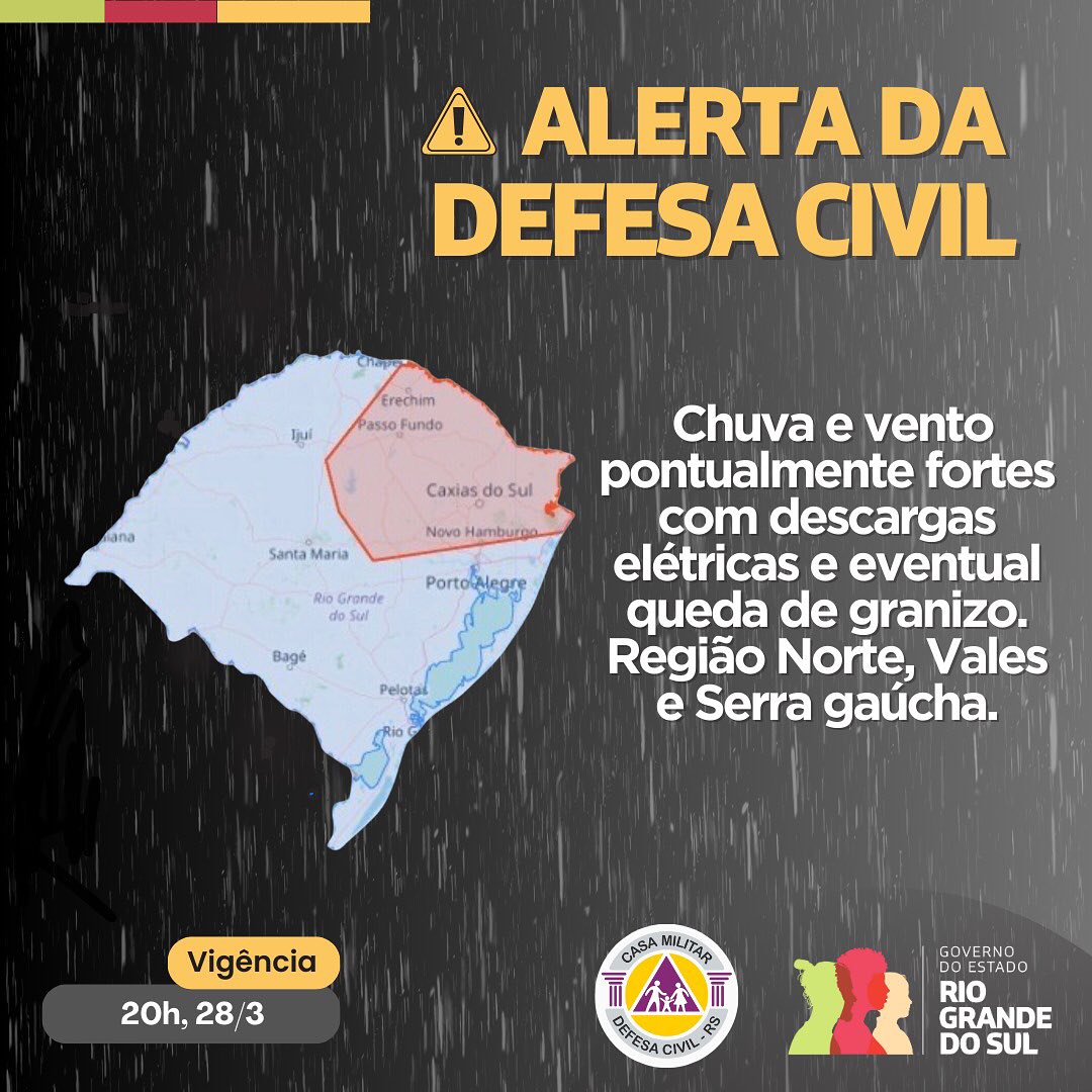 A Defesa Civil do Rio Grande do Sul emitiu um alerta para a população devido às condições meteorológicas adversas previstas para as próximas horas. Segundo o comunicado, há previsão de chuvas intensas, ventos fortes, descargas elétricas e eventual queda de granizo até às 20h desta quinta-feira, dia 28 de março.