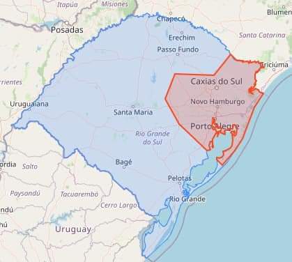 Há cerca de uma hora a Defesa Civil emitiu um alerta de chuva forte com risco de queda de granizo, descargas elétricas e ventos em forma de rajadas de até 70km/h nas próximas 4 horas, para a área delimitada em vermelho no mapa.
