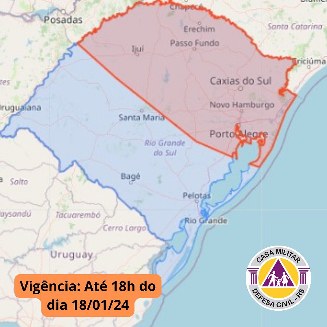 A Defesa Civil Estadual emitiu um alerta às 18h desta quarta-feira, válido por 24 horas, até as 18h de quinta-feira, para a possibilidade de alagamentos, cheias em arroios e córregos, e inundações em regiões ribeirinhas. A área destacada em vermelho no mapa está sob atenção.