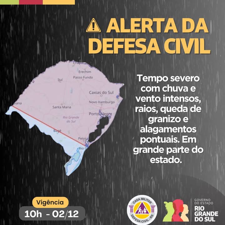 O aviso é válido até as 10 horas desta segunda-feira (2) na área vermelha no mapa. A Defesa Civil emitiu um alerta para condições climáticas severas em diversas regiões, válido até as 10h desta segunda-feira (2). O aviso destaca a possibilidade de chuva intensa, rajadas de vento, raios, queda de granizo e alagamentos pontuais.