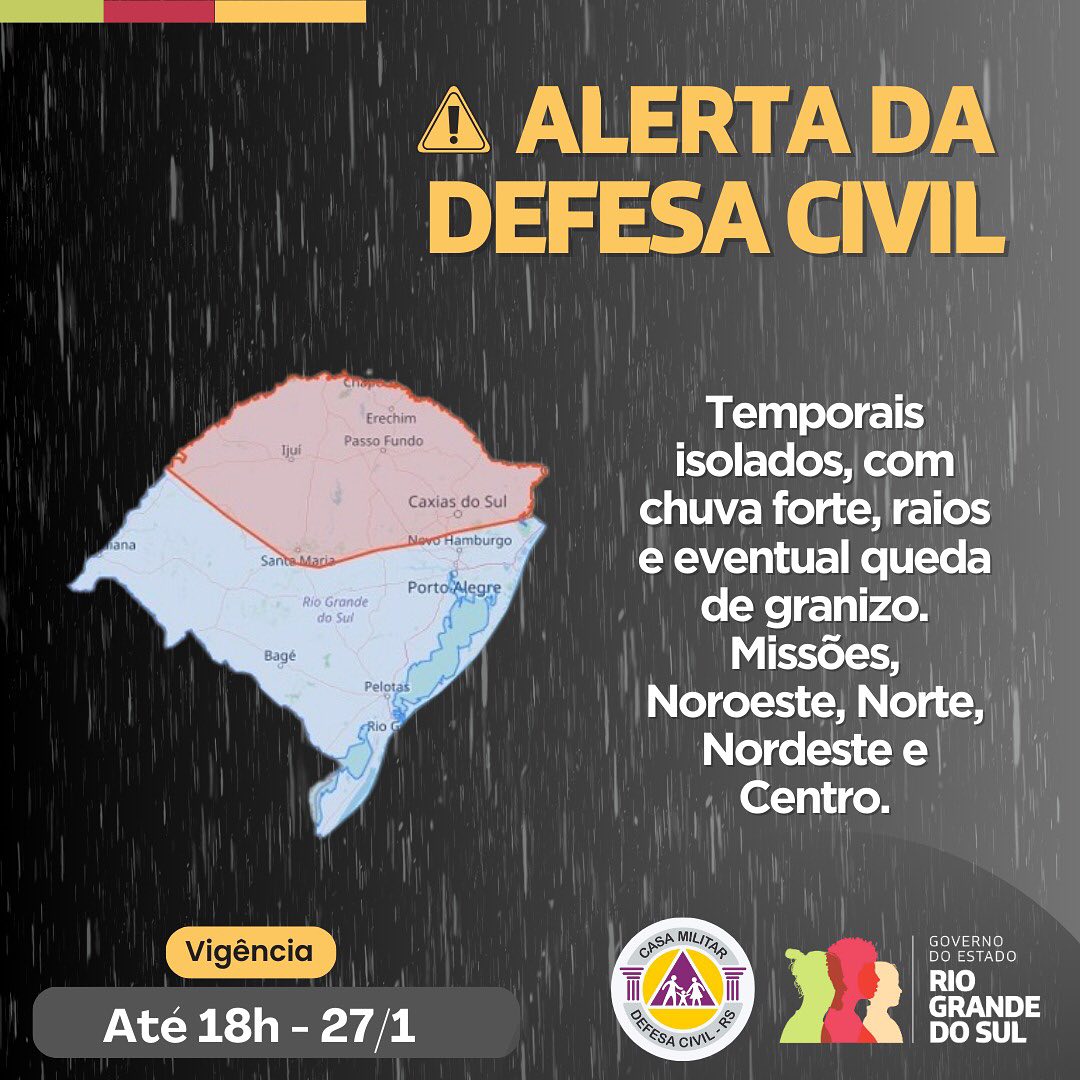 O aviso é válido até as 18h desta segunda-feira e reforça a importância de adotar medidas de segurança em caso de tempo severo A Defesa Civil emitiu um alerta para a possibilidade de temporais isolados nesta segunda-feira (27), com previsão de chuva forte, raios e eventual queda de granizo.