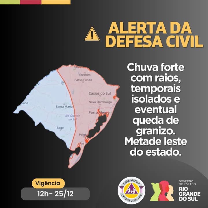 Aviso é válido até esta quarta-feira ao meio-dia A Defesa Civil emitiu um alerta para a possibilidade de chuvas fortes com raios, temporais isolados e eventual queda de granizo, válido até as 12h desta quarta-feira (25). Em caso de emergência, a população deve acionar os serviços pelo telefone 190 ou 193.