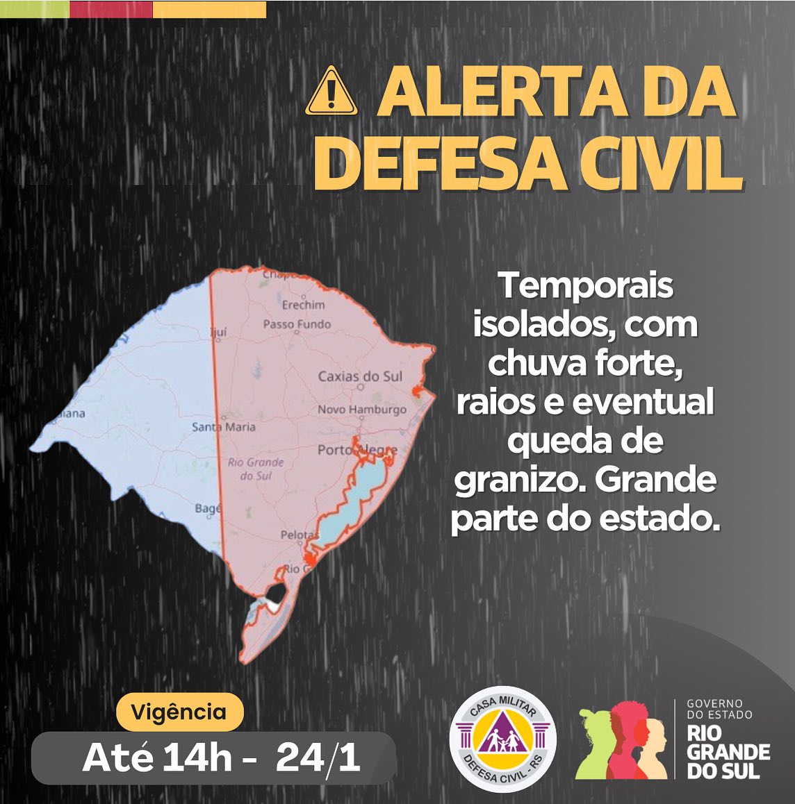 O aviso é válido até às 14 horas desta sexta-feira na área em vermelho no mapa A Defesa Civil alerta para a possibilidade de temporais isolados nas próximas horas, com ocorrência de chuva forte, raios e eventual queda de granizo em diversas regiões.