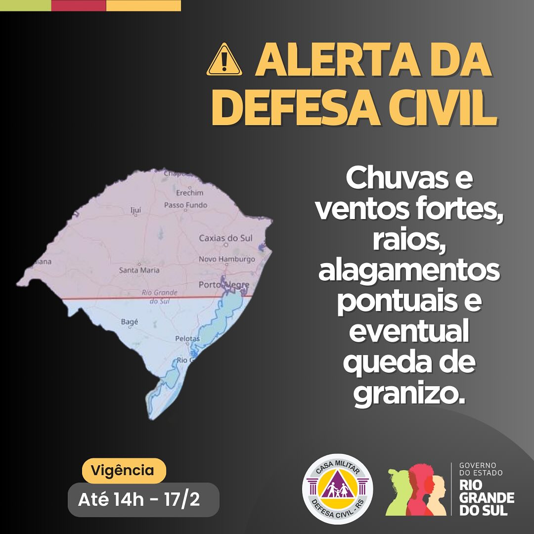A Defesa Civil do Rio Grande do Sul emitiu um alerta para a ocorrência de chuvas e ventos fortes, descargas elétricas, alagamentos pontuais e possível queda de granizo em áreas da metade norte do estado. O aviso é válido até as 14h de segunda-feira (17 de fevereiro).