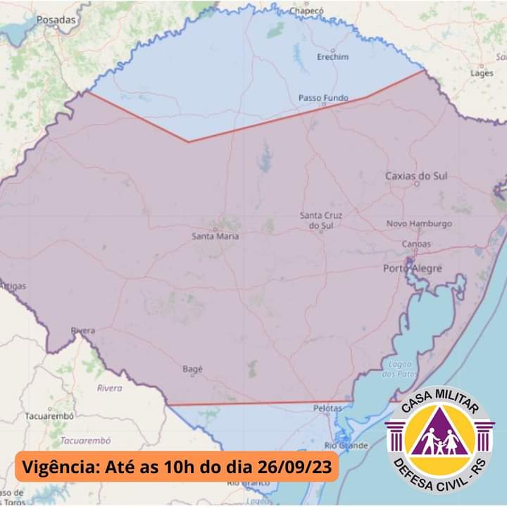 A Defesa Civil do Rio Grande do Sul acaba de emitir um alerta importante para a população gaúcha. Temporais com chuvas volumosas, descargas elétricas, eventual queda de granizo e vento forte são esperados até as 10h do dia 26 de setembro. Em caso de emergência, a população deve entrar em contato pelos números 190/193.