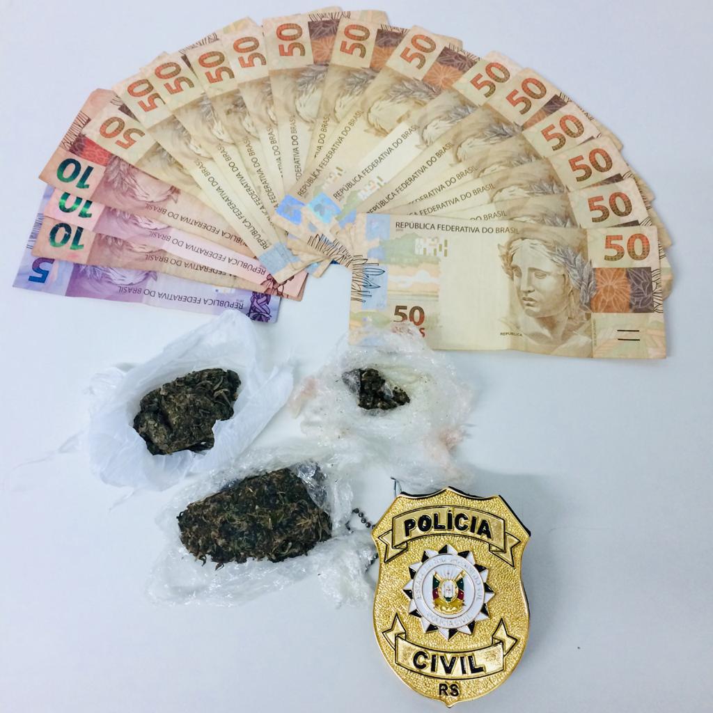 Com eles foram apreendidas quantidades de maconha e dinheiro Policiais Civis da Delegacia de Polícia de São Marcos com o apoio de Policiais Civis da DRACO/Caxias do Sul prenderam nesta tarde dois indivíduos. Os homens de 22 e 27 anos são investigados pela prática dos crimes de tráfico de drogas e associação para o tráfico.