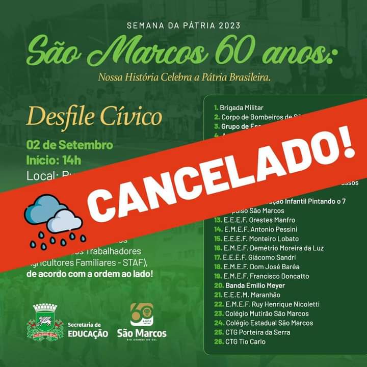 Devido a instabilidade climática e a previsão de mais chuva para este sábado (2), a Secretaria Municipal de Educação entendeu como necessário o cancelamento do Desfile Cívico que seria realizado na cidade hoje a tarde, a partir das 14h.