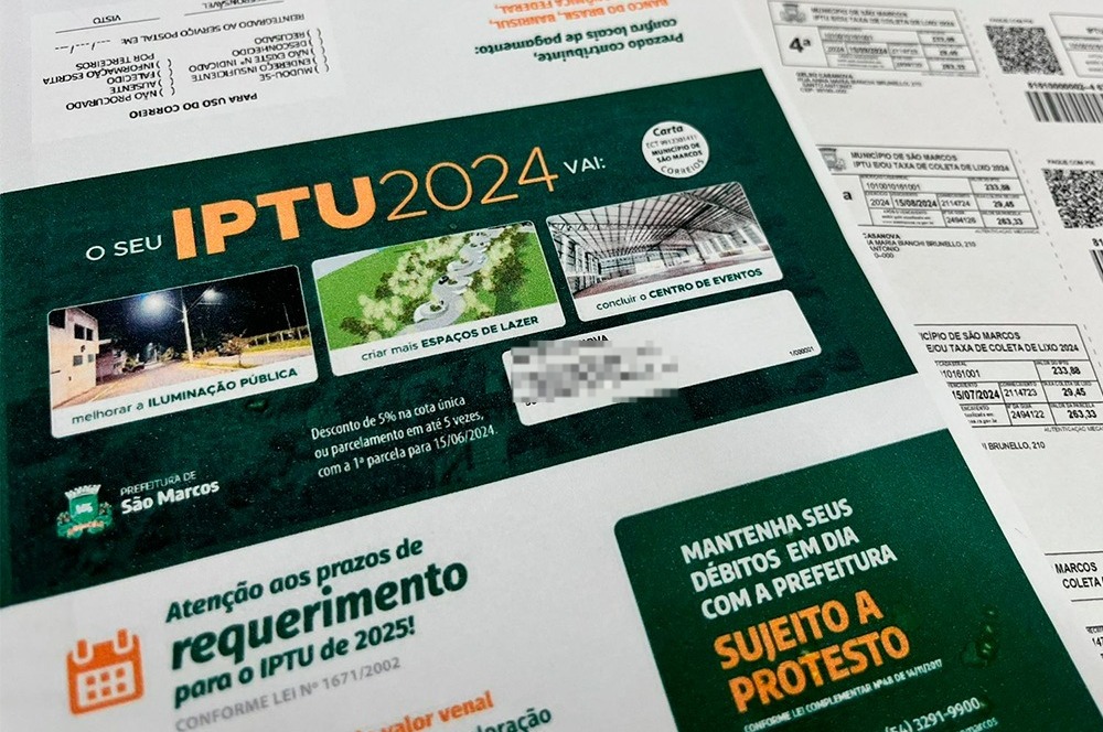 A Prefeitura de São Marcos começou a distribuir os carnês do Imposto Predial e Territorial Urbano (IPTU) esta semana. Com o vencimento da primeira parcela ou cota única programado para o dia 15 de junho, os contribuintes têm a possibilidade de parcelar o pagamento em até cinco vezes, com vencimentos mensais até outubro.