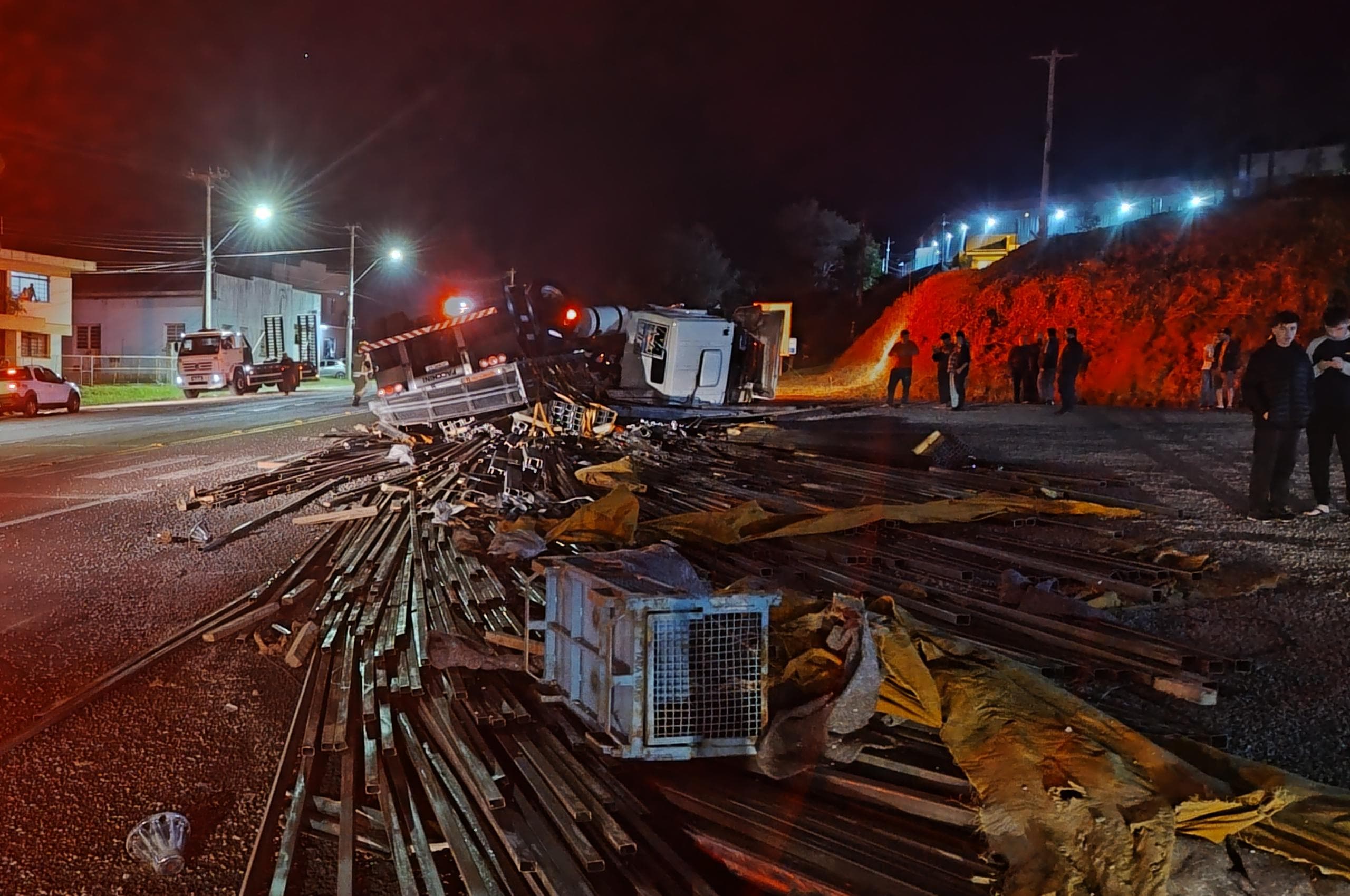Dois homens ficaram feridos após o tombamento de um caminhão Scania no km 112 da BR-116, em São Marcos, na noite desta quinta-feira (1º de maio). O acidente ocorreu por volta das 19h, em frente à Igreja de São Cristóvão, no bairro Michelon. O veículo seguia no sentido São Marcos-Vacaria e, segundo relatos de populares, havia saído de Caxias do Sul com destino a São Paulo, carregado com barras de ferro.