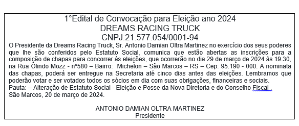 Edital de Convocação para eleição ano 2024 Dreams Racing Truck . Atualizado em 20/03/2024 às 10:03, por Equipe SMO. Serra Gaúcha Leia também: Bombeiros e Resgate Mergulhadores resgataram corpo de vítima de afogamento na cachoeira do Rio São Marcos nesta sexta-feira Morador de Caxias do Sul se afogou na Cascata de São Roque, nas margens da Rota Saonda na divisa com Caxias do Sul Polícia e Segurança Bombeiros realizam buscas por jovem desaparecido na cachoeira do Rio São Marcos Local é frequentado por banhistas em dias de calor e todos os anos registra óbitos por afogamento Social LEO Clube lança campanha NATALEO para arrecadação de brinquedos A ação mobiliza escolas, empresas e comunidade para garantir um Natal mais alegre às crianças são-marquenses Negócios e Economia Receita abre consulta a lote da malha fina do Imposto de Renda Cerca de 214 mil contribuintes receberão R$ 494,09 milhões