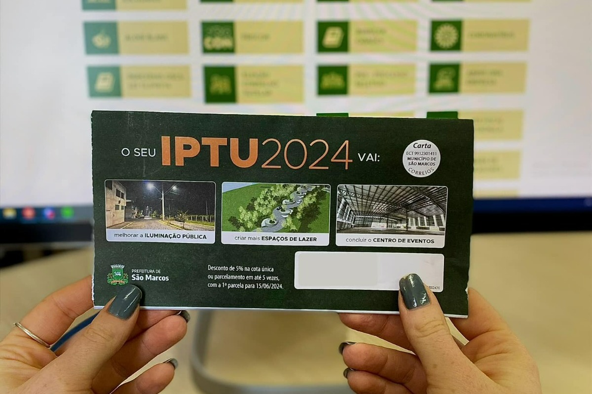 A Prefeitura de São Marcos está distribuindo os carnês do Imposto Predial e Territorial Urbano (IPTU). Com o vencimento da primeira parcela ou cota única programado para o dia 15 de junho, os contribuintes têm a possibilidade de parcelar o pagamento em até cinco vezes, com vencimentos mensais até outubro.
