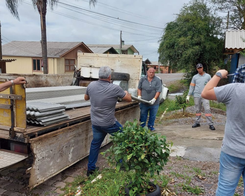 As lonas temporárias distribuídas anteriormente cobriram casas afetadas, e agora a substituição do telhado danificado está em andamento. O prefeito em exercício, Valmir Scopel de Oliveira, acompanha pessoalmente a entrega das telhas e destaca que a compra para substituição de telhados em prédios públicos também está em curso.