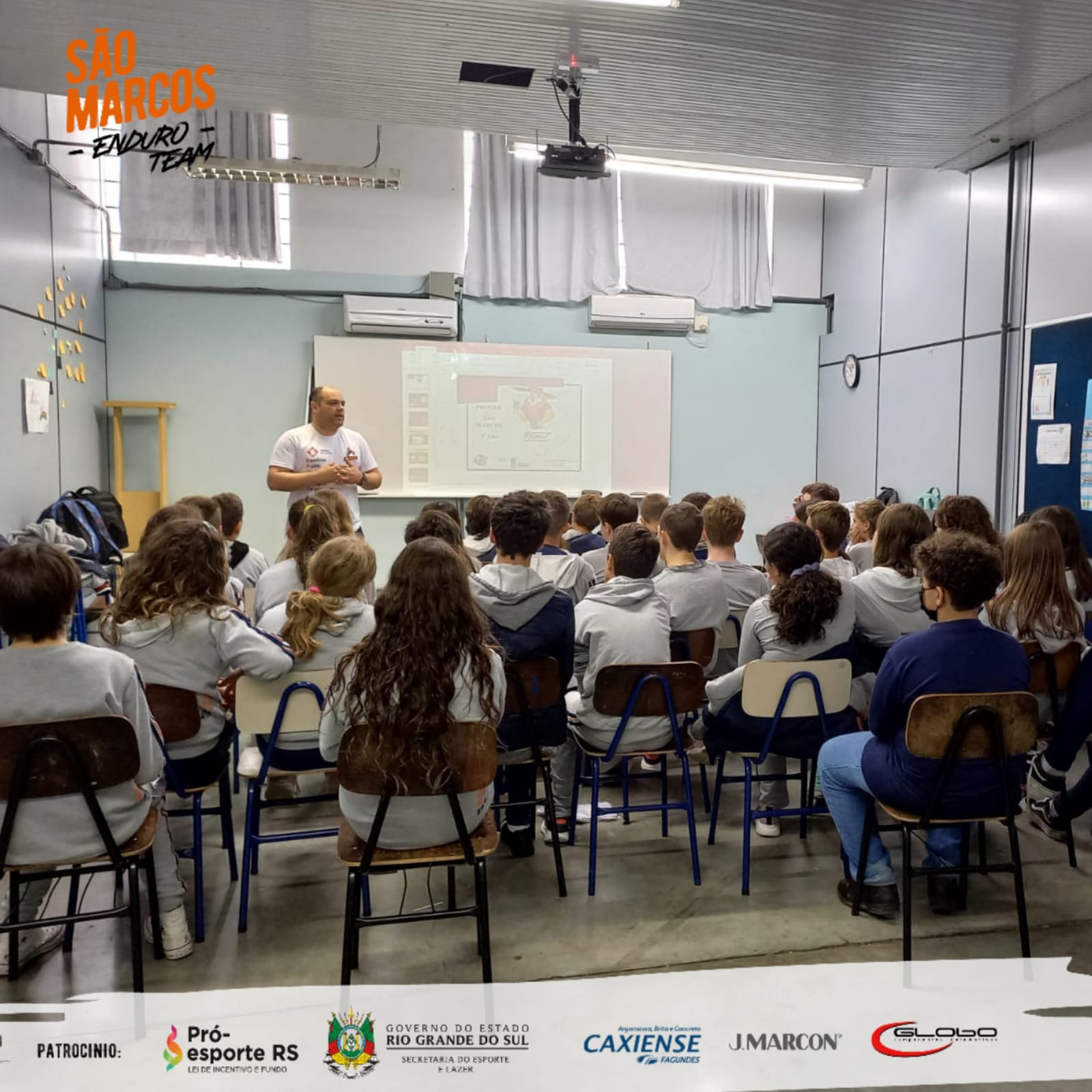 Cerca 100 alunos assistiram palestras com o policial Everaldo Cardoso Lopes, que falou sobre drogas lícitas e ilícitas e bulling. Ação é contrapartida da equipe São Marcos Enduro Team, ao projeto de Lei de Incentivo ao Esporte