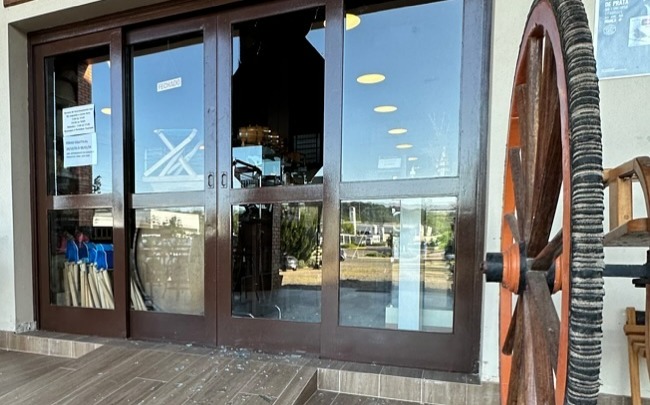 Vidro da porta foi quebrado para facilitar a passagem do meliante. Proprietário analisa câmeras de monitoramento e a polícia irá investigar