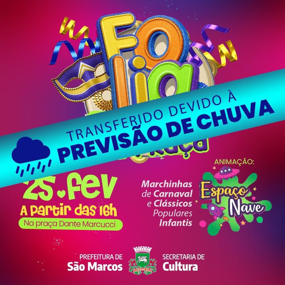 Ainda nao há nova data definida A prefeitura de São Marcos informa que o evento “Folia Infantil” que aconteceria neste sábado (25) na Praça Dante Marcucci foi transferido devido a previsão de chuva para esta tarde. Ainda não há nova data para o evento.
