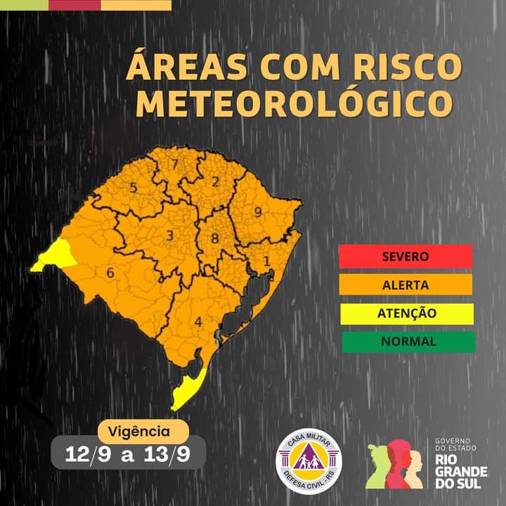 A Defesa Civil do Rio Grande do Sul emitiu um alerta para possíveis transtornos, como alagamentos e elevação dos níveis de arroios, córregos e pequenos rios, especialmente nas regiões mais afetadas pelas chuvas fortes e temporais. A população é orientada a seguir os Planos de Contingência de suas cidades e adotar medidas preventivas para minimizar os impactos das condições climáticas adversas.