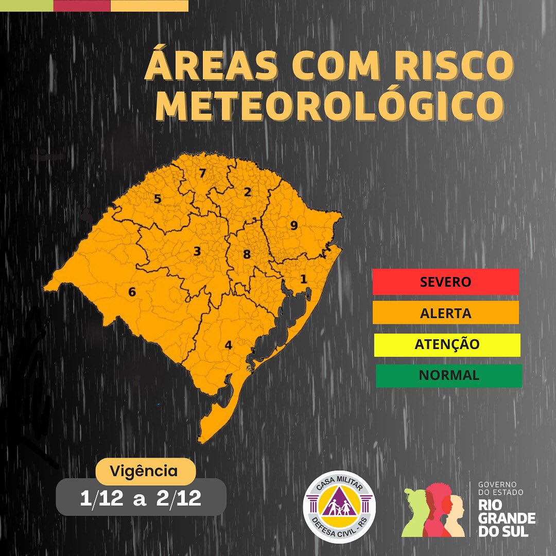 O Rio Grande do Sul enfrenta neste domingo (1º) e madrugada de segunda-feira (2) um cenário de instabilidade climática severa, com a formação de tempestades causadas pelo avanço de uma frente fria, associada a um sistema de baixa pressão na Argentina e à umidade proveniente do Norte do país. A combinação resulta em chuvas fortes, rajadas de vento intensas, descargas elétricas e possibilidade de granizo.