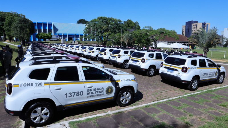 O Governo do RS entregou, na manhã desta sexta-feira (17/11), na Academia de Polícia Militar (APM), em Porto Alegre, 274 novos veículos para a Brigada Militar (BM). São 32 viaturas semiblindadas do modelo Renault Duster e 242 motocicletas Yamaha Lander para reforçar o policiamento ostensivo em 53 municípios gaúchos.