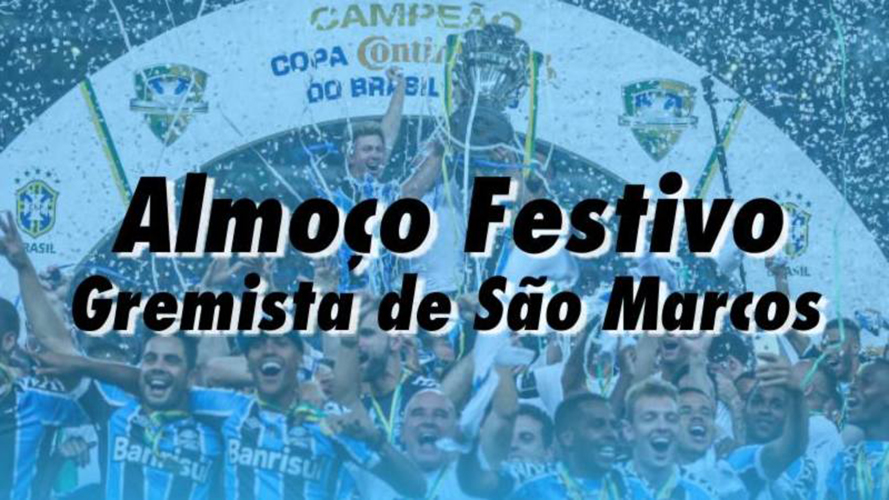 Aproveitando a boa fase do time e com o objetivo de aproximar clube e torcida, o Consulado Gremista de São Marcos promove neste domingo (5) a terceira edição do almoço festivo gremista. O evento acontece no salão nobre da AMSM e contará com a presença dos ex-jogadores Baltazar, Nildo Bigode, Paulo Nunes e Carlos Miguel e do atual presidente do clube Romildo Bolzan Jr.