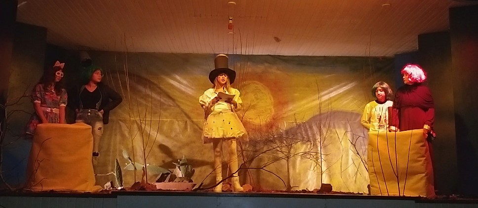 Depois, no palco, abrindo as apresentações e como forma de concentrar o público para os atos principais, do proscênio, ainda com a cortina fechada, ator faz a leitura interpretada de texto que conta a história de um pinheiro que foi transformado em livro. Na sequência, abre-se as cortinas para encenação da peça que aborda a necessidade de preservação do meio ambiente, principalmente no que diz da conscientização para o uso racional da água, levando a mensagem para que todos cuidem, zelem, preservem o planeta, em linguagem direcionada para crianças e adolescentes, preferivelmente para a partir de 10 anos de idade, mas excepcionalmente bem recebido por adultos também.