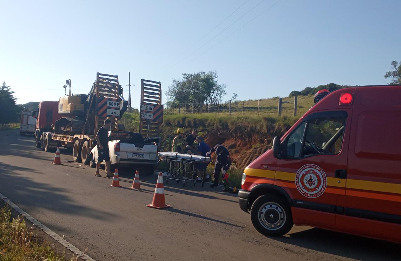 No local uma Montana acabou colidindo na traseira de um caminhão prancha. Do acidente restou ferido um homem de 53 anos, condutor do veículo menor.