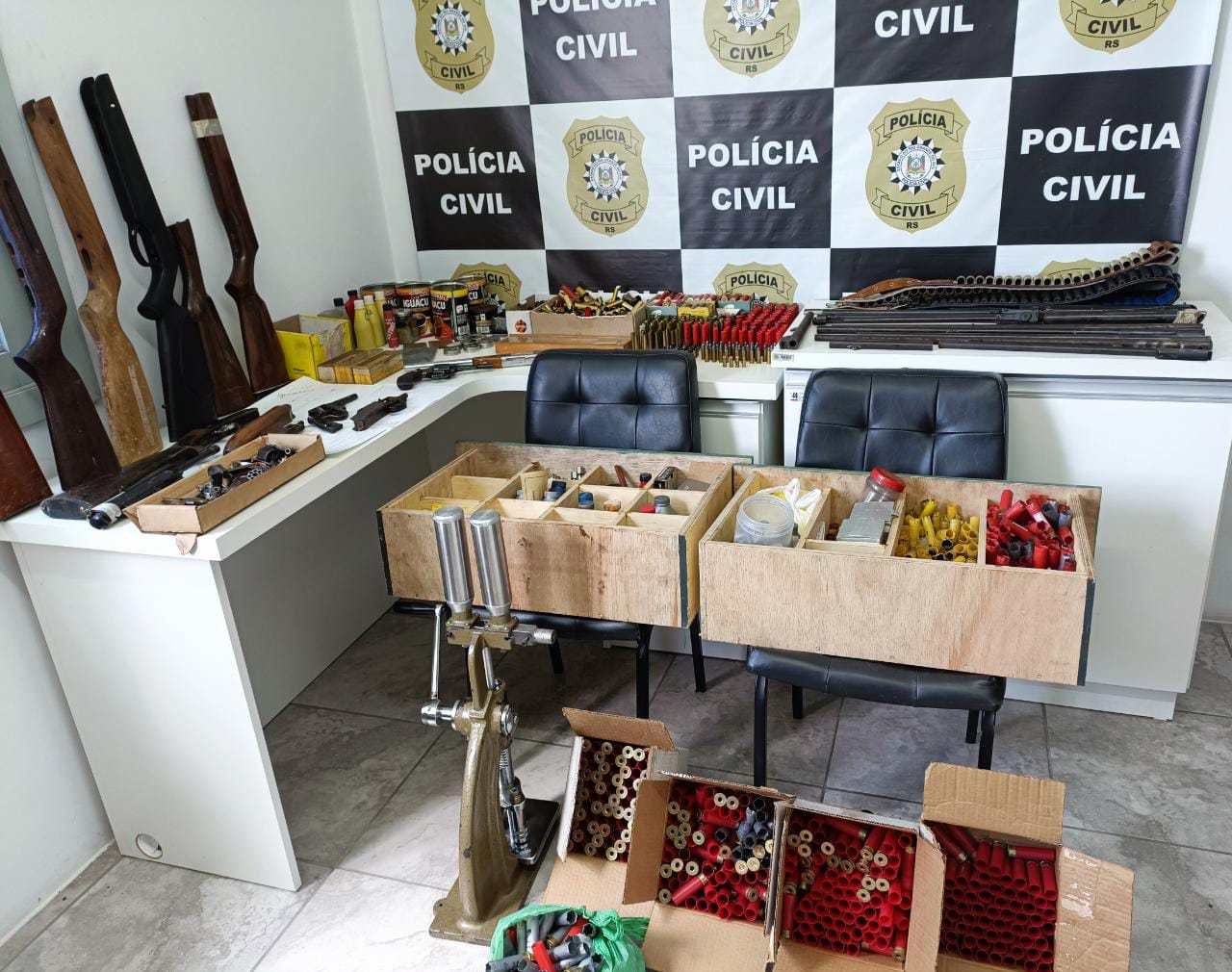 Idoso de 60 anos recarregava e fazia reparos e modificações em armas de fogo Após investigações, a Polícia Civil de São Marcos deu cumprimento a Mandado de Busca e Apreensão em estabelecimento comercial localizado no bairro Centro na manhã desta quarta-feira. A residência do suspeito também foi alvo de diligências.
