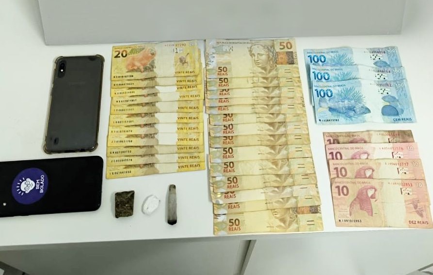 Os policiais encontraram no bolso da calça do suspeito uma porção de maconha, uma porção de cocaína e R$ 1.260,00 em dinheiro. Com isso o homem acabou preso por tráfico.