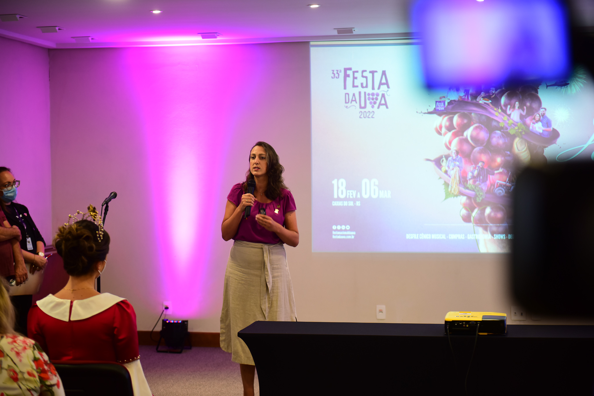 A secretária da Cultura e diretora de Cultura e Desfiles da Festa, Aline Zilli, anunciou novidades no Desfile Cênico Musical. São mais de 1 mil figurantes envolvidos, mais de 50 grupos participantes de seis alas que compõem o desfile deste ano. Uma das novidades é a lembrança e valorização das rainhas de festas passadas que estão em um carro alegórico. Aline também ressaltou o ressignificado do desfile, após a vivência da pandemia da Covid-19. A diretora ainda apresentou alguns projetos de carros que estão sendo elaborados e seus significados.