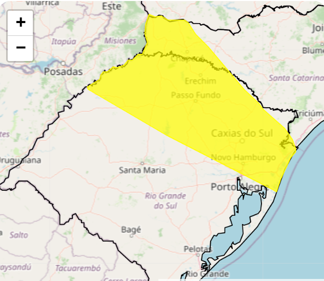 O Instituto Nacional de Meteorologia (Inmet) emitiu um alerta laranja, válido até as 10h da quinta-feira (13), para risco de tempestade no Estado. As regiões mais vulneráveis são o Sul, a Campanha, o Litoral Sul, a Região Central, a Fronteira Oeste e parte da Região Metropolitana e do Noroeste. Existe o risco de vento de até 100 km/h e altos acumulados, além da possibilidade de corte de energia elétrica, estragos em plantações, queda de árvores e registro de alagamentos.