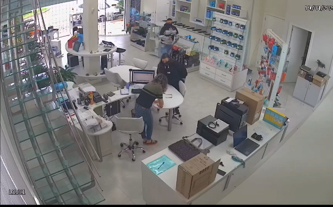 Dupla levou um notebook por volta das 9h30 De acordo com a proprietária da loja, localizada na Rua Monsenhor Henrique Compagnoni, foi levado um notebook da marca Lenovo que estava exposto. O furto ocorreu por volta das 9h30 mas só foi percebido perto do meio-dia, momento que os proprietários recorreram as imagens de monitoramento.